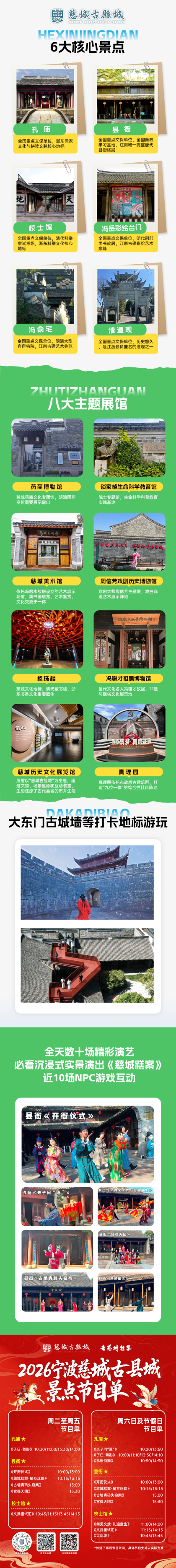 2.谈家桢生命科学教育馆,慈城美术馆,周信芳戏剧历史博物馆,抱珠楼展馆,真理园9:00-16:00;冯骥才祖居博物馆9:30-15:00;慈城历史文化展览馆9:00-18:30